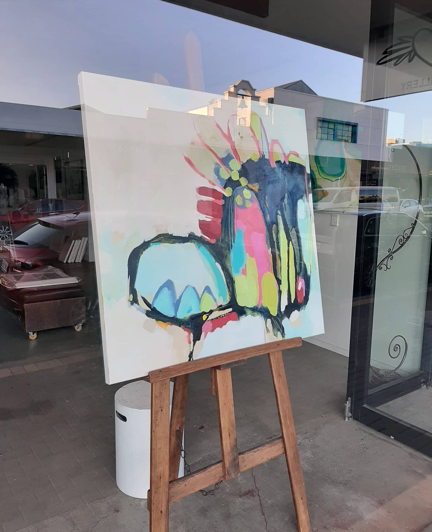 My aim as an artist is to engage the viewer and to create a sense of escapade, of romping across the canvas using a mix of intuition, spontaneity and more considered mark making. I’m a big fan of expressive, gestural brush strokes. I typically finish a painting with a final dot of colour (often orange or black) – a bit like a signature.